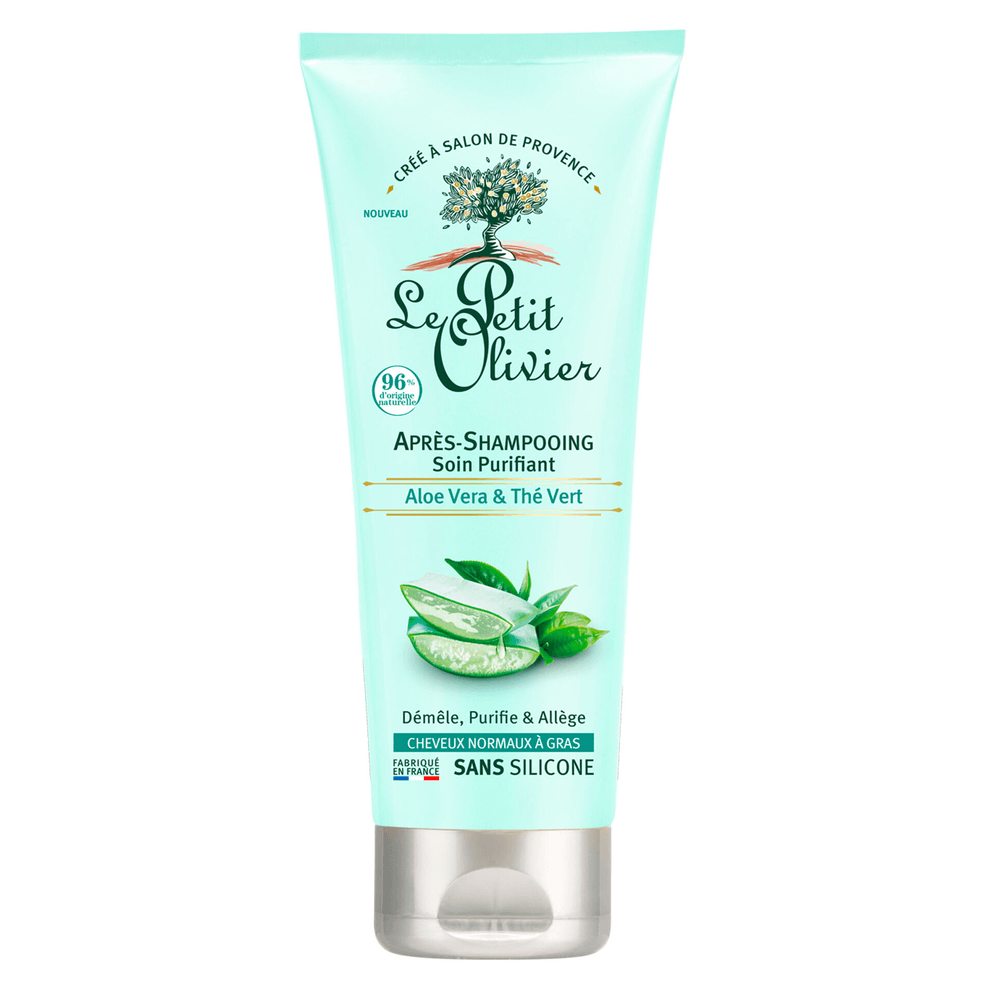 Le Petit Olivier se inspira de los beneficios de la naturaleza y ha seleccionado ingredientes emblemáticos para crear su Acondicionador para Cabello Normal a Graso con extracto de aloe vera y té verde.