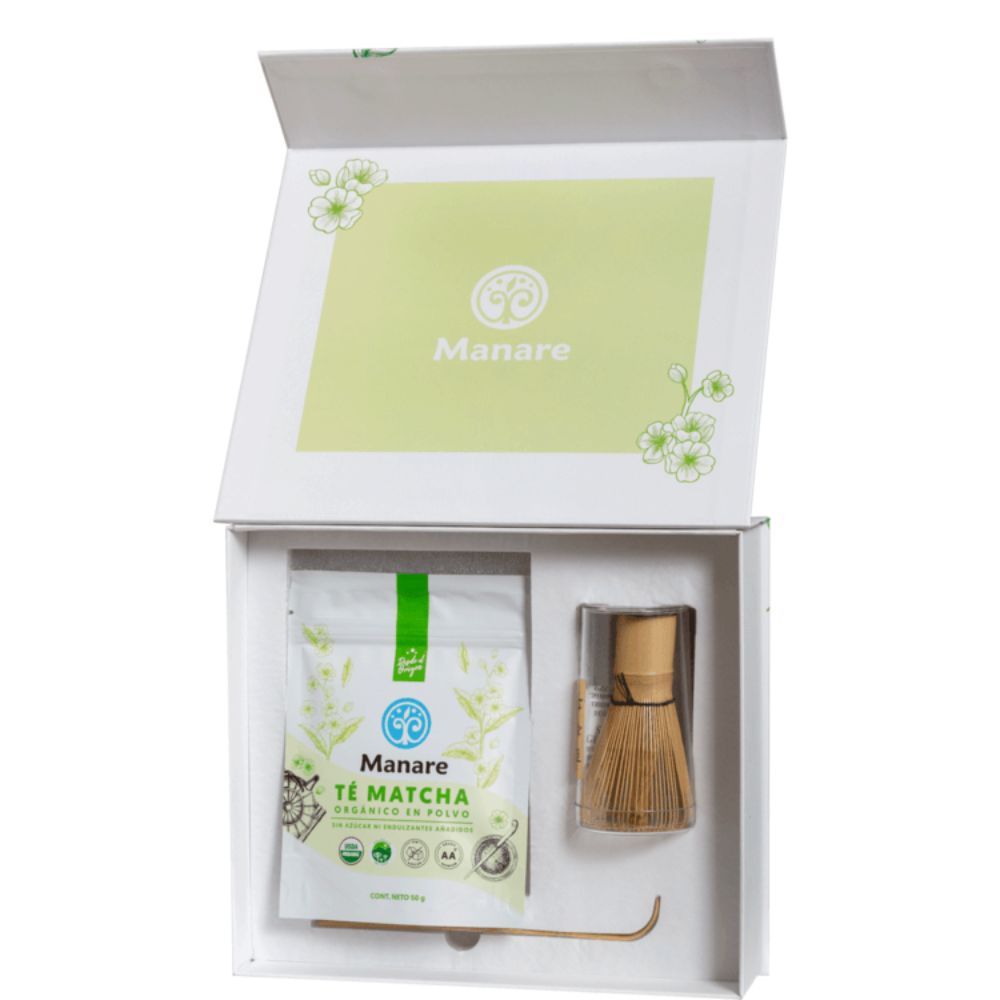 Esta linda caja viene además con los implementos necesarios para preparar el té matcha Manare de la forma tradicional.